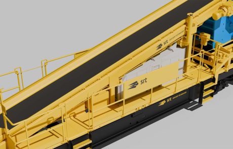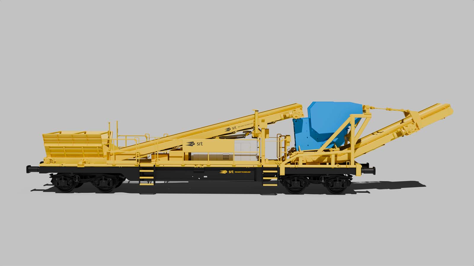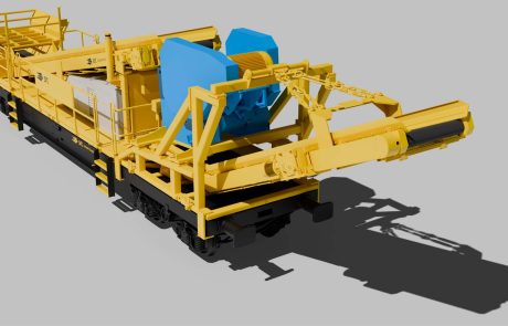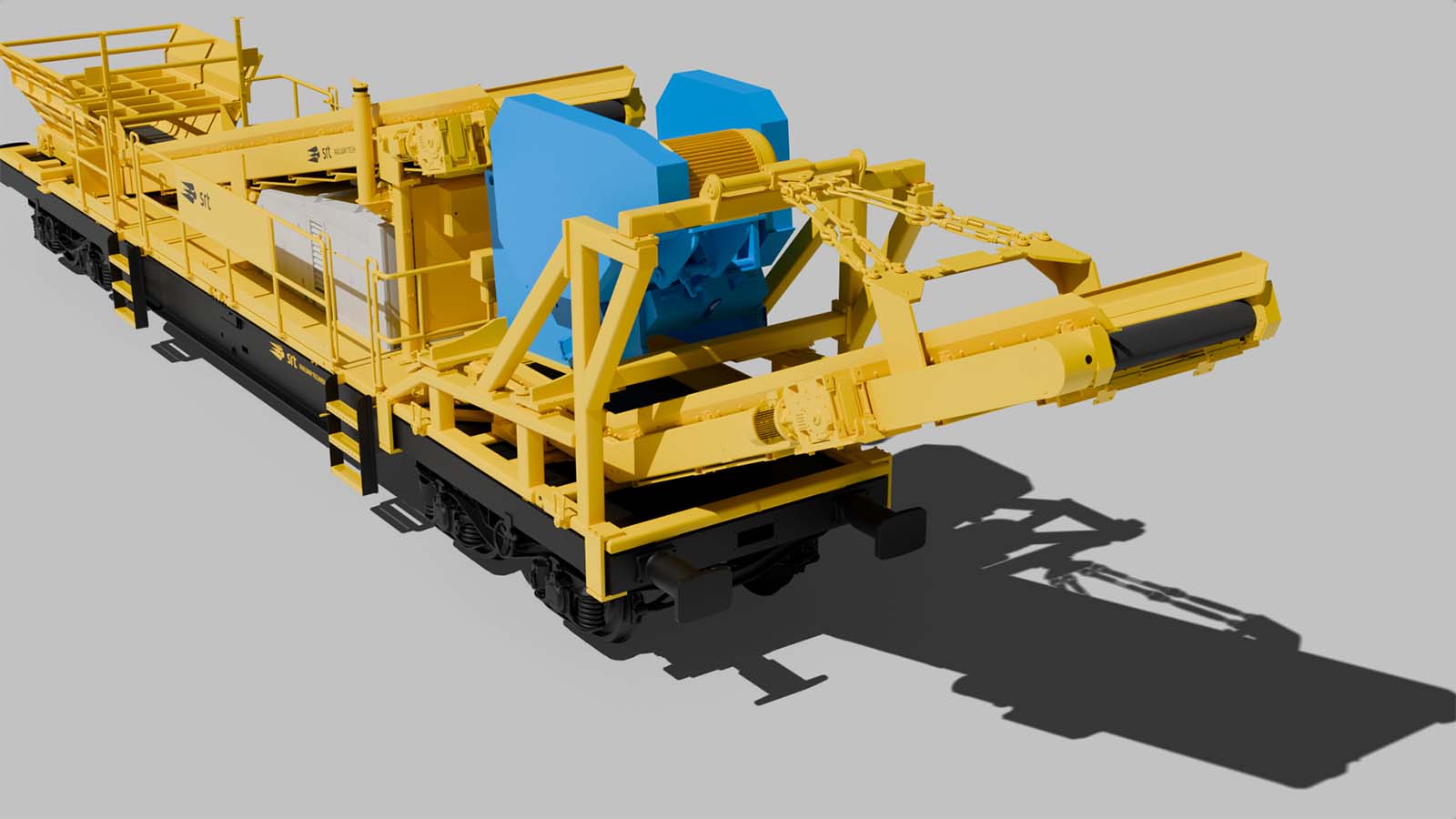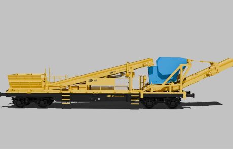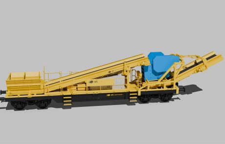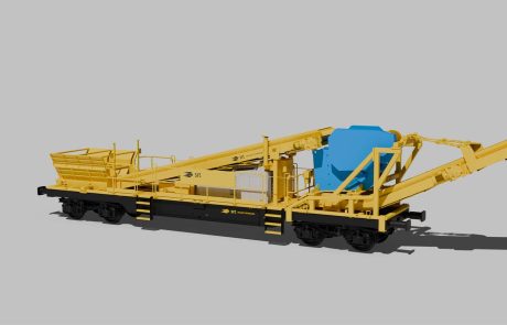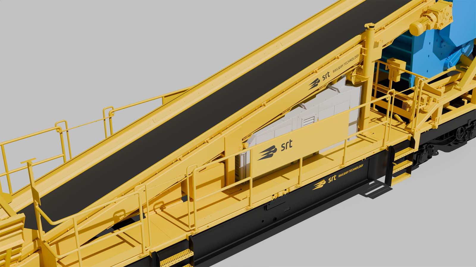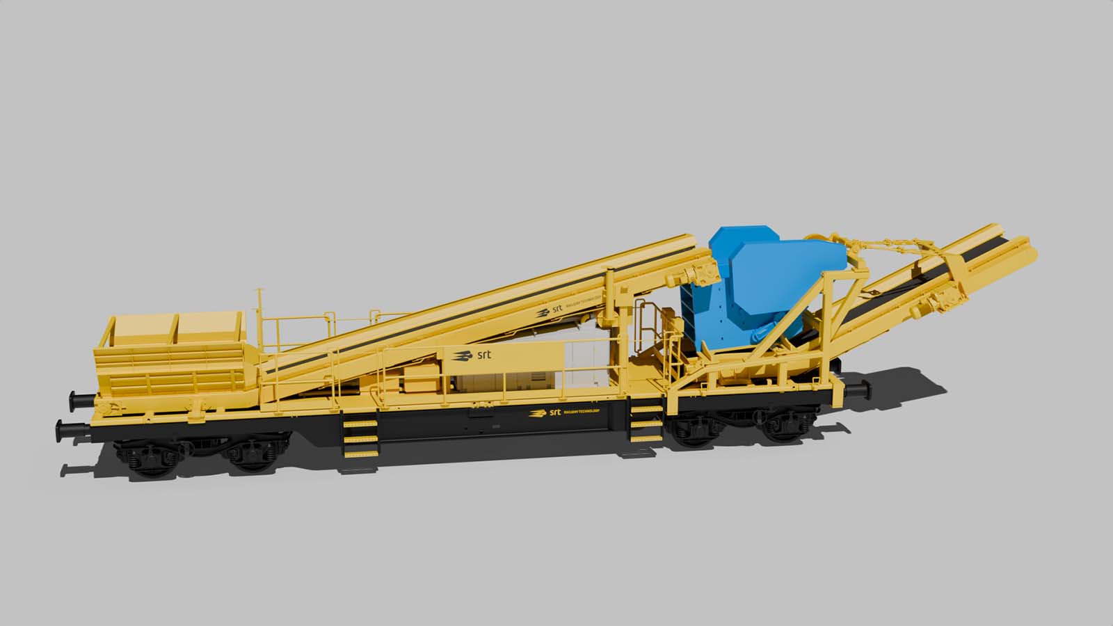 El vagón triturador Heavy consiste en un vagón plataforma de cuatro ejes de la línea Heavy de SRT, equipado con una máquina trituradora, una tolva compacta y una cinta transportadora. Durante los trabajos de demolición y excavación, permite reducir las piedras grandes al tamaño deseado y transferirlas mediante la cinta transportadora a la siguiente unidad DHS.