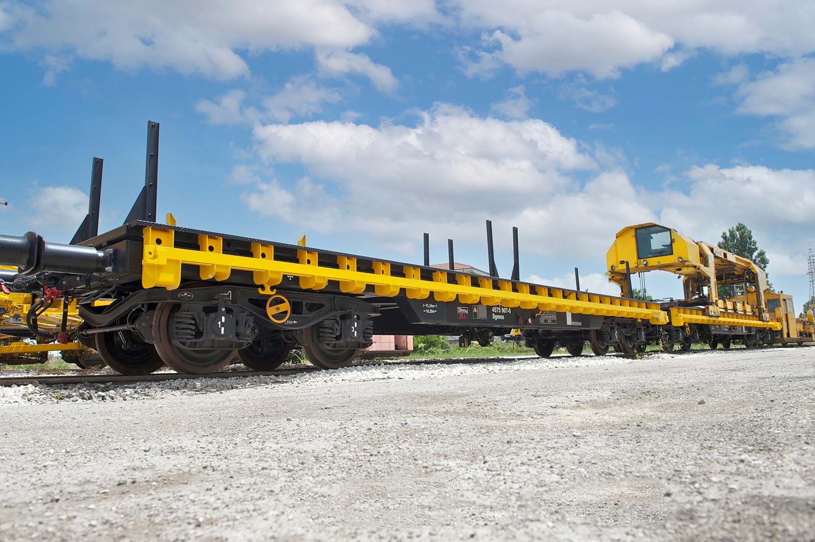 Questo sistema è costituito da un carro pianale a carrelli di tipo Heavy e da un allestimento porta traverse, configurando un mezzo d’opera conforme alle norme EN 14033 per la costruzione e manutenzione delle infrastrutture ferroviarie.